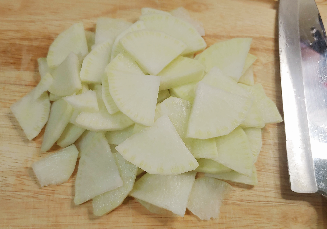3. 무는 껍질 벗겨 먹기 좋은 크기로 썰어 주세요.