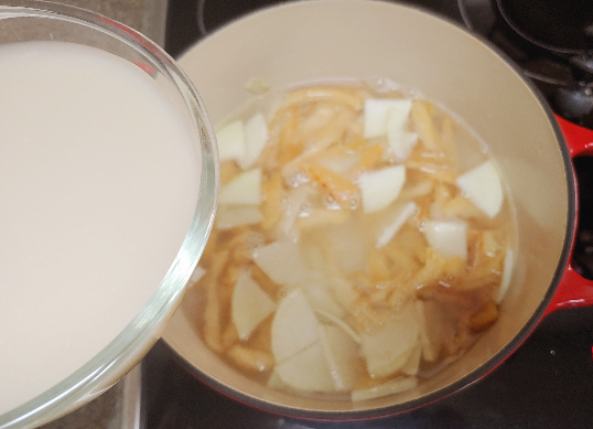 6. 무가 볶아지면 물 1L 와 사골육수 500ml , 콩나물 넣어 5~6분 끓입니다.