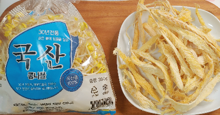 재료:콩나물 300g, 황태채 50g, 대파 1줄, 청양고추 2개, 홍고추 1개