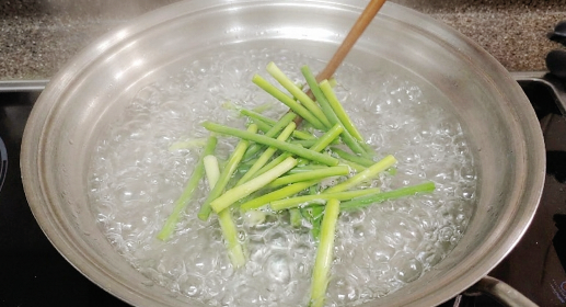 *마늘종은 겉은 부드러워 보여도 섬유질이 꽤 질긴 편이에요. 끓는 물에 30초 정도만 데치면 조직이 부드러워져서