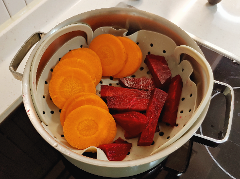 *당근에는 베타카로틴, 비트에는 다양한 항산화 성분이 들어 있는데, 이 성분들은 약하게 열을 가했을 때 체내 흡수가 더 잘되는 경우가 있습니다. 그래서 생으로 먹는 것보다 살짝 쪄서 사용하면 영양을 더 편하게 섭취할 수 있습니다.