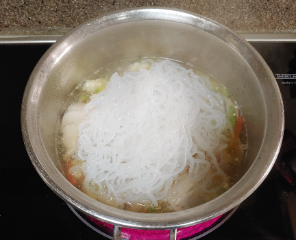 7.끓여놓은 국물과 1인분 분량의 곤약 국수를 30초 정도 끓여 면기에 놓아주세요.