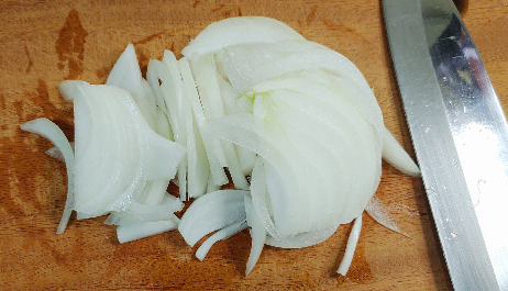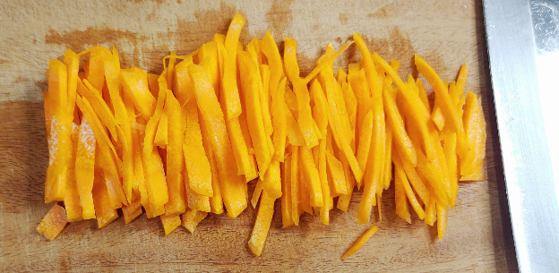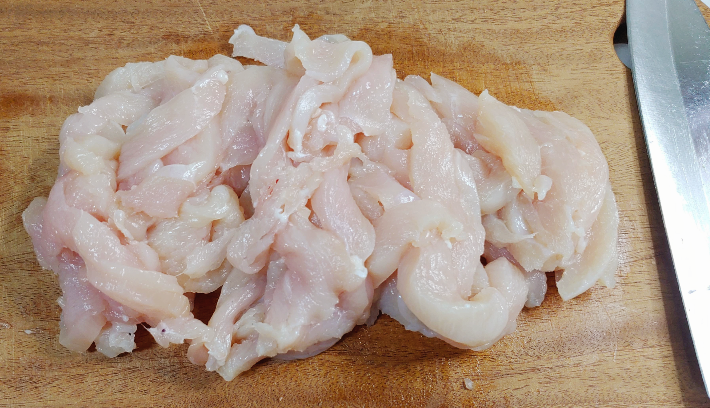 1.닭가슴살은 반으로 포를 떠 채 썰어 주세요.