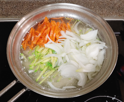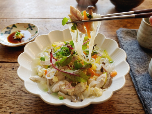 *재료: 우무국수 1인분, 닭가슴살 2덩이, 애호박 1/2, 당근 1/3, 양파 1/2, 청양고추 1개, 어린잎 채소 약간, 소금 1/2T, 멸치액젓 1T